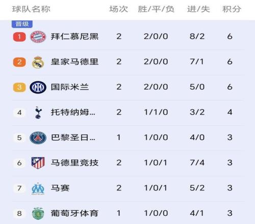 拜仁积6分以净胜球优势高居积分榜第一,同分的皇马和国米紧随其后,紧跟着积4分的热刺,积3分的巴黎、马竞和马赛等队,本菲卡积0分位列第30,同样0分的阿拉木图凯拉特第36垫底!