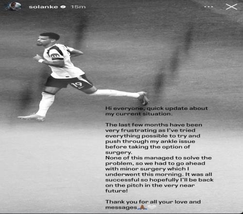 北京时间10月2日,热刺前锋索兰克在社媒中自宣自己接受了脚踝手术,将伤停一段时间。