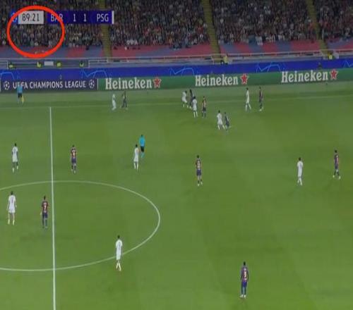 此后长达50分钟的时间里,两队都无法再次破门。第89分钟,巴萨后场控球。此刻,巴黎开始全场逼抢。89分钟20秒,巴黎成功断球。巴黎球员并不着急反击,他们将球回传。