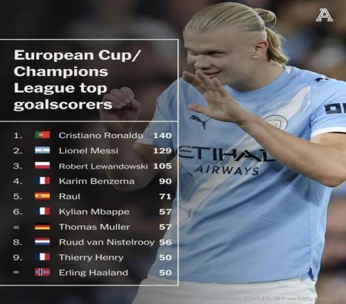 最快达成欧冠50球所用场次排名!梅西66场哈兰德比梅西少用17场