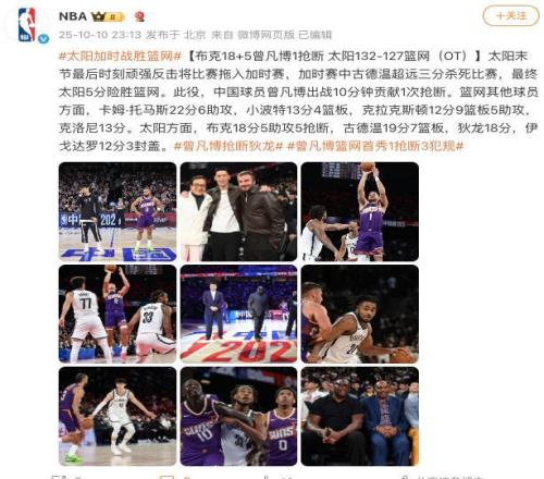 首场比赛为菲尼克斯太阳对阵布鲁克林篮网,最终太阳队经过加时赛,以 132:127战胜篮网队。第二场比赛将于10月12日晚上7点举行。