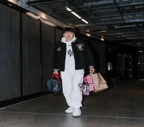 赛前,开拓者官方更新社媒,晒出了赛前的球员入场照,中国球员杨瀚森依旧带着粉色小书包。