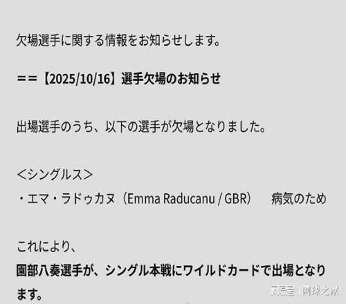 我们再来关注球员动态。北京时间昨晚,WTA500东京站官宣,英国一姐拉杜卡努因病退出了将于下周开打的这站比赛。祝拉杜早日康复吧!