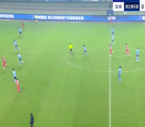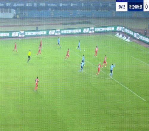 第55分钟,王钰栋突入禁区传中,卡列洛凌空将球踢进大门,浙江队扳平比分。