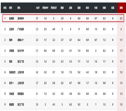 赵博新是一位实龄球员,他还有很大的成长空间。在这次的全国U17男篮联赛,赵博新代表清华附中征战比赛,他场均得到11.1分8.9篮板2.3盖帽,在盖帽榜上排名第一。