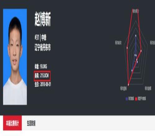 2025全国男篮U17联赛上,15岁的清华附中新星赵博新有着出色的表现,以场均得到2.3次盖帽加冕联赛盖帽王。根据中国篮协官网的最新数据,赵博新的身高已经长到了2米15,他在继续长高当中。最近两年,他的个子长得太快了。