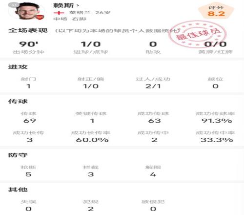 雷速体育11月2日宣 英超第10轮,阿森纳2-0伯恩利,本场比赛,赖斯首发出场,他全场比赛数据如下: 出场90分钟,射门1次,打进1球 尝试过人2次,成功1次 传球69次,传球成功率91.3% ,关键传球1次 成功长传3次,长传成功率60% 抢断5次,拦截3次,解围4次 赖斯进球GIF: |