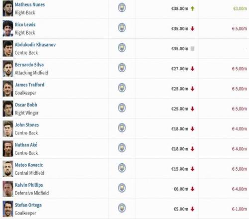 曼城球员身价变动:哈兰德上涨至2亿欧,罗德里下跌1500万欧