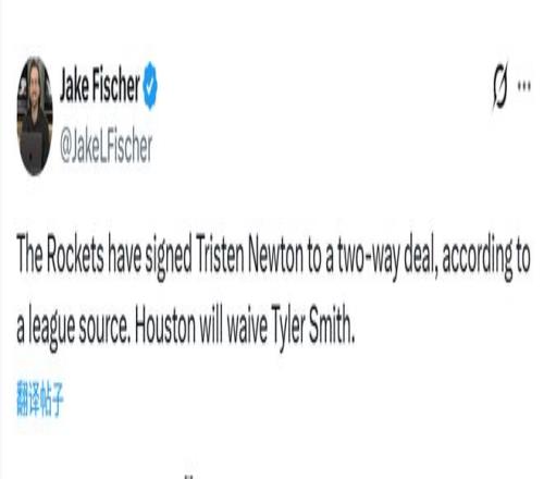 北京时间1月4日,据名记Fischer报道,火箭已与特里斯滕-牛顿签下双向合同,他们将裁掉泰勒-史密斯。随后名记Scotto表示,牛顿本赛季至今效力于G联赛的爱荷华狼队效力,场均得到26.8分,投篮命中率为49.4%,三分球命中率为37.6%,此外还有7.7次助攻、4.9个篮板和1.7次抢断。