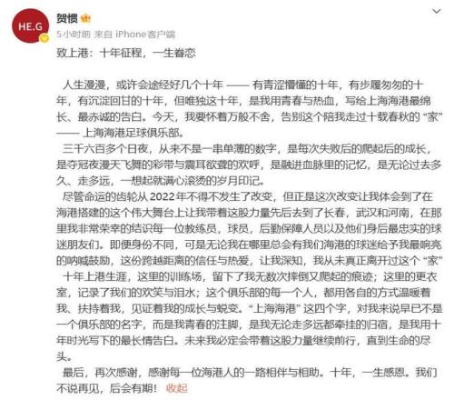 同城球队上海海港则再次面临球员离队,现年32岁的老将贺惯在个人社交账号上发文告别球队。贺惯自2013年加盟上港,总计代表上港出场209场,攻进7球并送出4次助攻。但这几个赛季,贺惯不断被租借到其他中超球队。